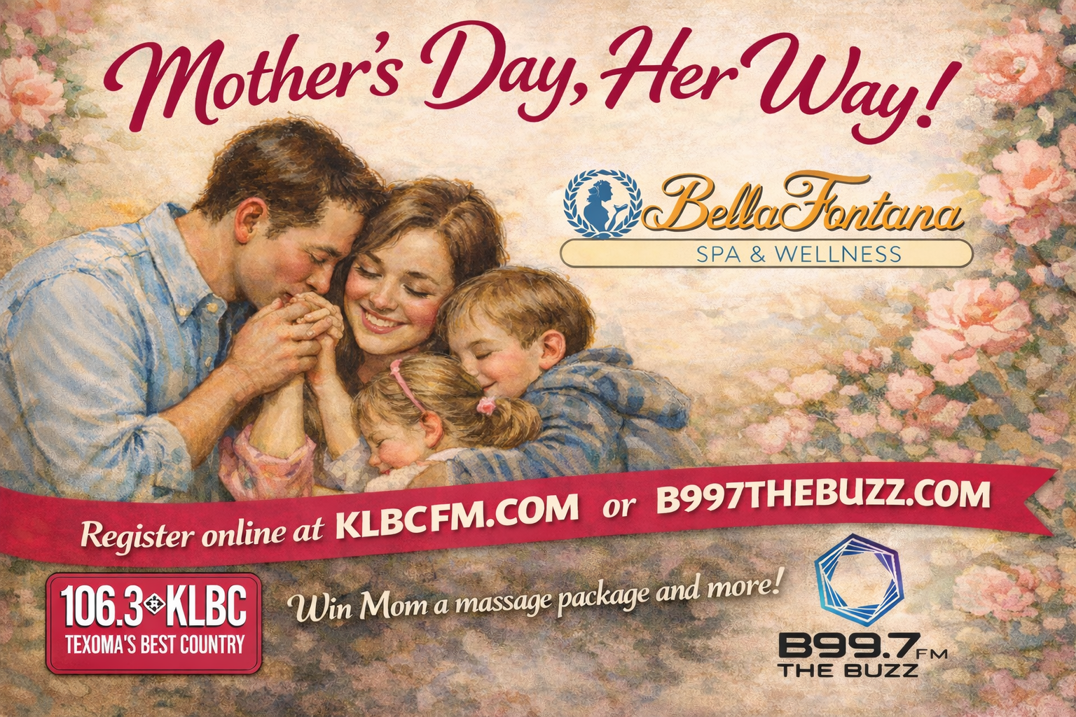 KLBC 106.3 and B99.7 The Buzz are partnering with Bella Fontana Day Spa in Denison for our 12th Annual Mother’s Day Her Way Giveaway! Enter by clicking the banner and registering. If we draw your name, Mom will love the pampered massage she’ll receive from Bella Fontana Day Spa! Hurry and register, we announce our winner on Friday, May 8th!